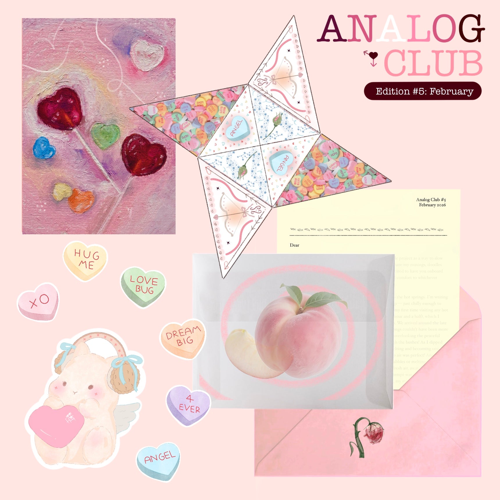 What's inside: This month's mail includes a letter, a 4x6 inch postcard, a Victorian love token, a clover cat sticker and 1/6 emoji stickers 🍡